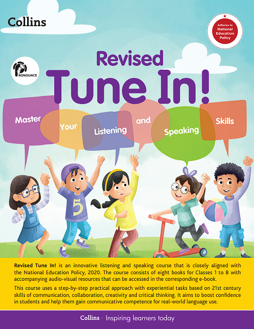 Revised Tune In! is an innovative listening and speaking course that is closely aligned with the National Education Policy, 2020. The course consists of eight books for Classes 1 to 8 with accompanying audio-visual resources that can be accessed in the corresponding e-book.