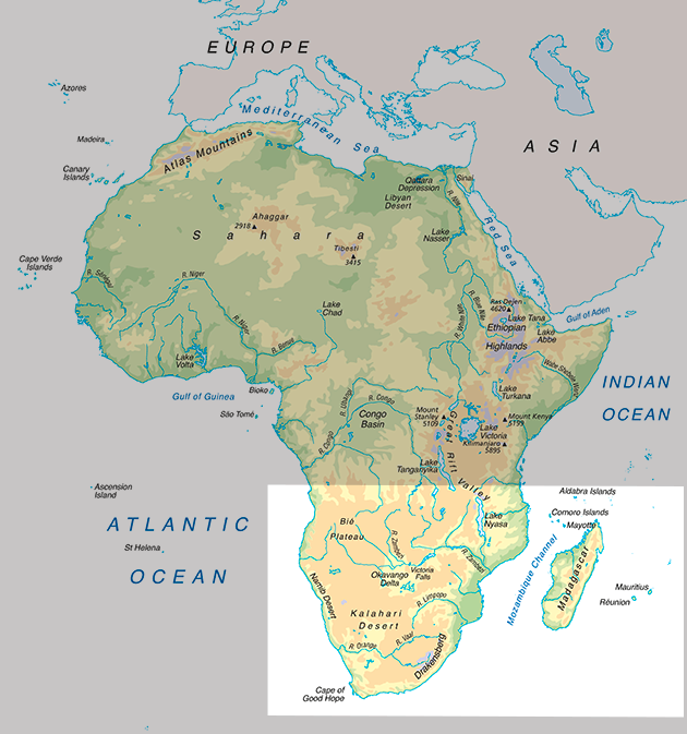 Southern Africa is the southernmost region of the African continent. Its landscape is varied, ranging from forest and grasslands to deserts. The region has both low-lying coastal areas, mountains and extensive desert areas of the Namib and Kalahari. Namibia lies on the Atlantic coast and the landlocked states of Zambia, Zimbabwe and Botswana extend through to Mozambique on the Indian Ocean coast. In northeast Botswana the Okavango Delta, the world's largest inland delta, is formed where the Okavango River empties onto a swamp in the Kalahari Desert.